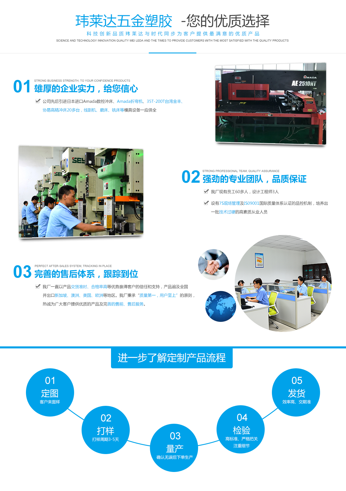 深圳市瑋萊達五金塑膠有限公司的前身是深圳市寶安區西鄉藝銘五金模具廠,于2003年成立,是一家服務于汽車、工業、醫療、新能源、光伏等行業的五金加工企業,專業從事五金模具設計、模具制作、五金沖壓加工、精密鈑金加工、機箱機柜定制、數沖手板打樣、新能源配件等五金件一站式服務。公司注冊資金1000萬元,廠房面積達3000平方米,是廣東珠三角地區生產各類五金產品中規模較大、產品齊全的五金制造廠。